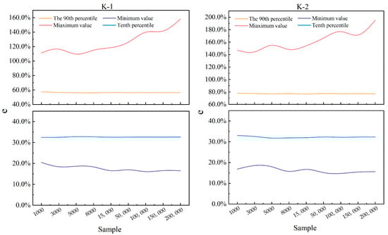 Figure 7 shows the statistical results of e corresponding to different random search sample sizes. With the increase in the sample size, the trend of the error values at the 90th and 10th percentiles in the two cases was relatively smooth, but the changes in the maximum and minimum values of the errors were different. The maximum error of the candidate samples showed an increase in fluctuation with the increase in sample size, while the minimum error showed a decrease in fluctuation. The minimum concentration error of K-1 was the largest at sample size 1000, which was 20.4%. The minimum error of sample size 15,000 and 200,000 were close to each other, and there was a small decrease compared with the minimum error of sample size 1000. There was some fluctuation in the minimum error of the sample size in the range of 15,000–200,000. The minimum concentration error of K-2 was the largest at sample size 3000, which was 18.5%. The minimum error of sample sizes 50,000 and 200,000 were close, and they decreased slightly with respect to sample size 3000. The minimum error fluctuated at a sample size of 15,000, and the minimum error value was larger than the value at a sample size of 50,000. To sum up, the minimum concentration error of the solution set tended to stabilize when the sample size was larger than 50,000. The minimum error of the solution set generally tended to decrease when the sample size of the random search increased, so larger sample sizes should still be recommended. Therefore, in all subsequent analyses, the random sample size was set to 100,000.