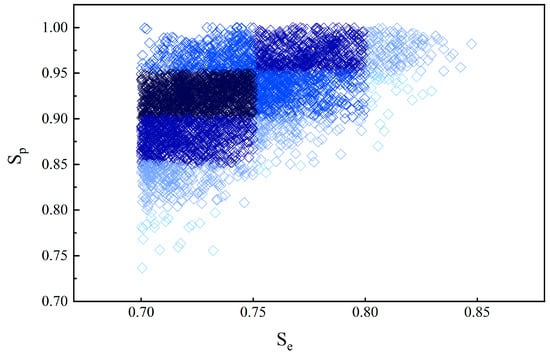 Only the nearly 10,000 candidate solution samples with ≥ 0.70 (e ≤ 30.0%) were selected for analysis in this section, and the distribution of their evaluation metric values is plotted in Figure 8, due to the large sample size. As can be seen in the top right corner of Figure 8, the minimum value of e for the obtained candidate solutions was about 15.3%, and the value of this sample was 0.98. The closer to the upper right region of Figure 8, the smaller the number of solution samples was, but the distribution was also more concentrated. The scores of solution samples in the interval 0.80 ≤ < 0.85 were more centrally distributed in the range of 0.87 to 1.00, where 90% of the samples were concentrated in the interval of values 0.94–1.00. This means that there was some consistency between the two indicators of the optimal sample. The solution samples with higher scores also had higher scores. Therefore, this part of the sample was also the sample with a higher for the composite score, and their was in the range of 0.92–0.99. In contrast, the number of samples in the ranges of 0.75 ≤ < 0.80 and 0.70 ≤ < 0.75 was much larger, and the larger the concentration error, the more the samples were. However, as the relative error increased, the difference in metric scores between the samples continued to increase. Looking at Figure 8 from right to left, the index of the samples at 0.75 ≤ < 0.80 ranged from 0.84 to 1.00, with 92% of the samples having a index greater than 0.90. In contrast, the index of the samples at 0.70 ≤ < 0.75 ranged from 0.74 to 1.00, with 90% of the samples having a index greater than 0.85. This suggested that, as the consistency of the samples with scores increased, the consistency of also increased. It can also be found that there were differences between the two indexes by analyzing Figure 8 from the top down. The samples with the score of 0.95–1.00 were the samples with the highest overlap rate, but the corresponding scores were scattered and varied between 0.70 and 0.85.