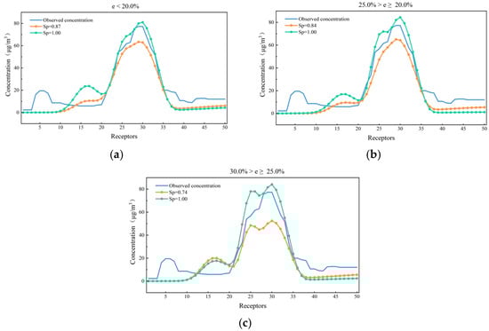 Specifically analyzing the simulated concentration results corresponding to typical candidate solution samples could help us to further understand the differences between the two indexes. The results of comparing the simulated and observed concentrations for a series of solution samples are given in Figure 9. In each error group, the concentration distribution curve in green corresponded to a sample with a score of about 1.00. The green samples in Figure 9a–c can be considered very close to the observed concentration curve if only the curve shape is concerned without considering the score. However, the relative error of concentration corresponding to these three solution samples was actually quite different. Similarly, the orange sample in Figure 9a was similar to the green sample in Figure 9c, if only the concentration curve was concerned. In fact, the index score of the former was better than , while the index score of the latter was better than .