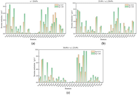 The unsatisfactory emission rate results based on matrix H of Figure 6a,c were initially understood as incomplete source list information collected. This means that there may be other sources of emissions that are not included in the inversion, so some of the observed concentration data may not be explained. However, the concentration error of the inverse results is still not satisfactory, even after confirming the completeness of the emission source list. Therefore, the simulation scheme of variable meteorological conditions was considered and adopted. The subsequent source analysis in this paper will only be based on the optimal meteorological condition parameters in the simulation scheme with variable meteorological conditions.
