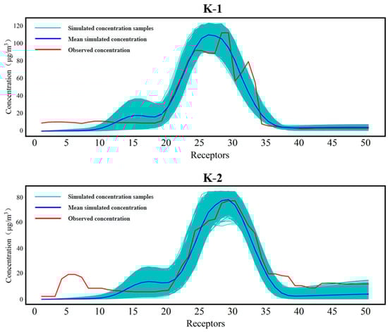 The final emission rate estimation results were obtained by statistics of the top 1% solution samples with better index score, as mentioned above. In the evaluation results of candidate solution sample quality, the of the top 1% solution samples with higher comprehensive scores in the two cases were 0.92–0.97 and 0.92–0.99, respectively. The matching degree between the simulated concentration and observed concentration was high, and the simulated concentration corresponding to the optimal solutions is shown in Figure 11. As can be seen from Figure 11, the simulated concentration of the better solution could basically reproduce the concentration peak near the receptors 20–35 on the mobile observation road section, which indicated that the source of most NOx substances in this road section had been captured. The small concentration peak near the receptors 1–11 in case K-2 were not simulated, which would be further analyzed in the discussion section.