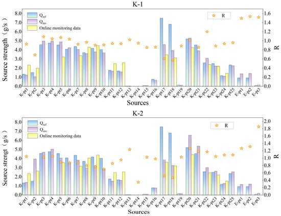 Figure 13 presents the contribution of each source to the concentration at receptors under the final emission rate estimation results, and it can be seen that the NOx concentration at the receptors 20–35 in the optimal solution was mainly from the emissions of the sources K-pt2–K-pt12 and K-pt22.