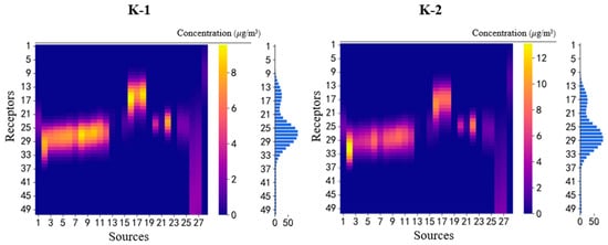 Concentration contributions from each source for final results. The heat map on the left side of each subgraph represents the concentration–response values at each receptor from each source’s emission under inverse calculated emission rate, μg/m3. The bars on the right side represent the total concentration at each receptor under the inverse calculated emission rate, μg/m3.
