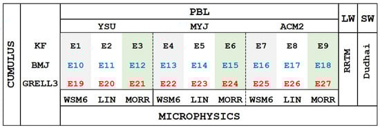 Experimental set up. Each row contains experiments with KF, BMJ, and Grell CU schemes. First 3 columns: YSU PBL; columns 4–6: experiments with MYJ PBL scheme; and columns 7–9: ACM2 PBL scheme. Columns 1, 4, 7: WSM6 MP scheme; columns 2, 5, 8: LIN MP scheme; and columns 3, 6, 9: Morrison MP scheme. All 27 experiments utilize RRTM LW and Dudhia SW radiation schemes.