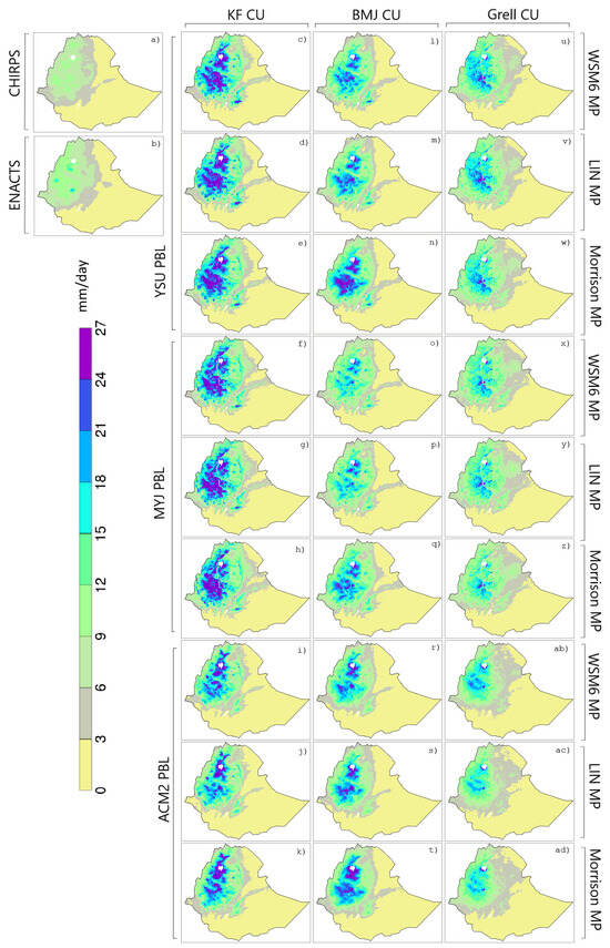 Mean summer (JJA) rainfall (mm/day) in 2002 for (a) CHIRPS, (b) ENACTS, and WRF simulation. Simulations (c–k), (l–t), and (u–ad) used KF, BMJ, and Grell CU schemes, respectively. Rows 1–3: YSU; rows 4–6: MYJ; and rows 7–9: ACM2 PBL schemes. Rows 1, 4, and 7: WSM6; rows 2, 5, and 8: LIN; and rows 3, 6, and 9: Morrison MP scheme (Figure 2).