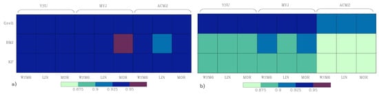 The WRF simulations were ranked using an aggregate score (AS) that comprised normalized mean absolute error with respect to weather stations and gridded data (MAEStn and MAEGrd), mean error in frequency of rainy days (ERD), the Pearson correlation coefficient (R), and the pattern correlation coefficient (PCC) between observed (gridded) and simulated mean JJA rainfall (Equation (3)). Equal weights were assigned to each score during aggregation and lower (higher) AS indicated better (worse) performance of WRF simulations. Among the 27 experiments ranked, no simulation performed the best or worst across all five statistics (Table 3). In general, simulations with the Grell (KF) CU scheme performed the best (worst) in terms of MAE (both station and grid-based). Simulations with Grell CU also performed the best (worst) in terms of PCC (ERD) while simulations with the BMJ CU scheme were the worst (best) in terms of PCC (R). Simulations using KF CU were best performing only in terms of capturing frequency of rainy days (ERD). It can also be noted that using the YSU and MYJ PBL schemes with the Grell CU scheme improved performance in terms of reproducing the spatial patterns of mean JJA rainfall (i.e., PCC) at the expense of deteriorating performance in terms of frequency of rainy days (i.e., ERD). All experiments that performed better in terms of MAE, ERD, and R used the ACM2 PBL scheme but the six worst performing experiments in terms of PCC used ACM2 PBL.