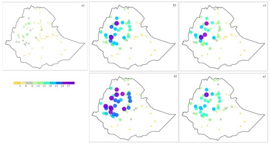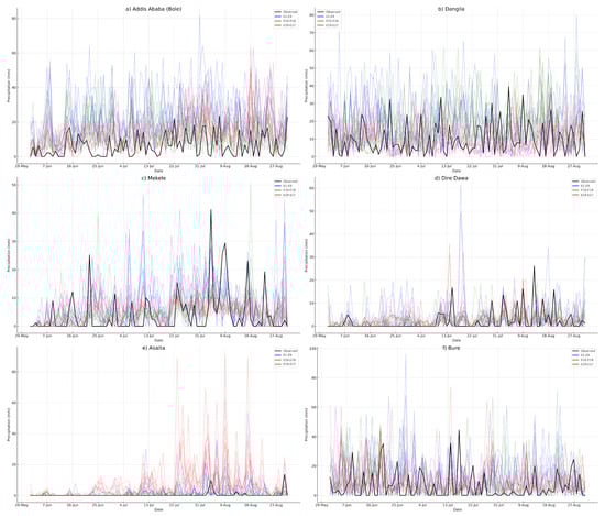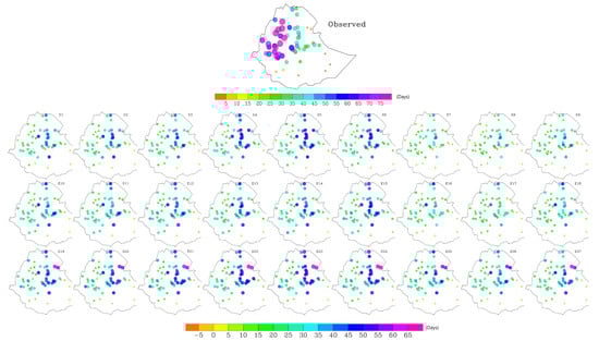 In general, all simulations involving the Grell CU scheme (E19–E27) showed a higher bias compared to corresponding experiments utilizing the KF and BMJ CU schemes (Table 2). When averaged over all stations and experiments, rainy days bias for the nine Grell-only experiments had a bias of around 31.1 days while KF-only and BMJ-only simulations showed 24.8 and 26.3 days, respectively. The higher bias in rainy day frequency observed with the Grell scheme suggests its convective triggering mechanism might be too sensitive for the complex terrain of Ethiopia, potentially exacerbating frequency bias, as noted in similar studies [66]. The rainy day frequency was most sensitive to the selection of PBL schemes, with bias ranging from 21.6 days for ACM2-only experiments to 31.6 days for MYJ-only experiments. On the other hand, rainy day frequency was least sensitive to MP schemes, with only 1 day difference between MP schemes (Table 2). In general, all the CU and MP schemes performed better when used together with ACM2 PBL scheme. For example, the average bias increased from 18.2 days when KF CU (E7–E9) was used with ACM2 PBL to 25.9 and 30.3 days when KF CU was used with YSU PBL (E1–E3) and MYJ PBL (E4–E6), respectively. A similar difference was observed when bias was averaged over the PBL schemes (regardless of CU and MP options), where ACM2-only experiments (E7–E9, E16–E18, E25–E27) had a significantly lower bias (i.e., 21.7 days) compared to YSU-only (E1–E3, E10–E12, E19–E21; 28.9 days) and MYJ-only experiments (E4–E6, E13–E14, E22–E24; 31.6 days). In addition, out of the nine experiments with the least bias averaged over stations, seven used the ACM2 PBL scheme. When considering frequency of rainy days as an evaluation criteria, the above results suggest that simulation E8 (KF CU, ACM2 PBL, and LIN MP) followed by E7 (KF CU, ACM2 PBL, and Morrison MP) performed relatively better (Figure 5, Table 2 and Table A1).