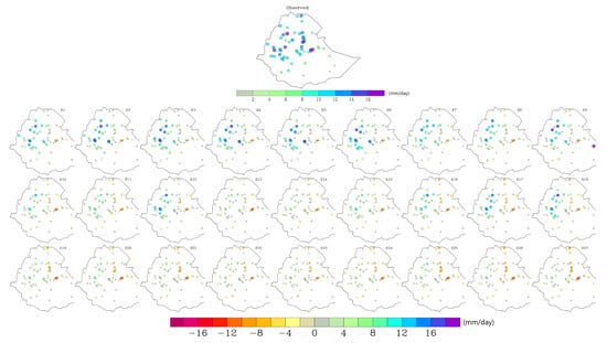 In terms of daily rainfall intensity, simulations showed a general spatial pattern where intensity was overestimated over the highlands (i.e., central, western, and northwestern Ethiopia) and either slightly overestimated or underestimated elsewhere (Figure 6). This pattern was a reverse of the bias in the rainy day frequency, where areas with larger (smaller) rainy day bias had a smaller (larger) bias in rainfall intensity. As for mean seasonal rainfall, intensity showed the most sensitivity to the selection of CU parameterization options followed by PBL, and MP options. For example, mean absolute bias (MAB) in rainfall intensity for experiments using KF CU (E1–E9) changed by a maximum of 1 mm day when changing PBL and MP options. On the other hand, changing KF CU to BMJ CU (E10–E18) or Grell CU (E19–E27) resulted in up to 2 mm day change in MAB in intensity (Table A2). This can also be seen from a summary of MAB (Table A2, last column) where MAB averaged over similar CU options has a relatively larger difference (1.6 mm) compared to differences in the PBL (0.4 mm) and MP (0.2 mm) parameterizations.