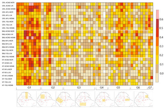 Pearson correlation coefficient between observed and simulated daily precipitation during the summer of 2002 for 27 WRF simulations. Y-axis labels show cumulus, PBL, and microphysics schemes for each of the 27 experiments. Red dots indicate the location of weather stations and yellow boxes indicate the weather stations in each geographic group shown as G1 to G7 on the x-axis.