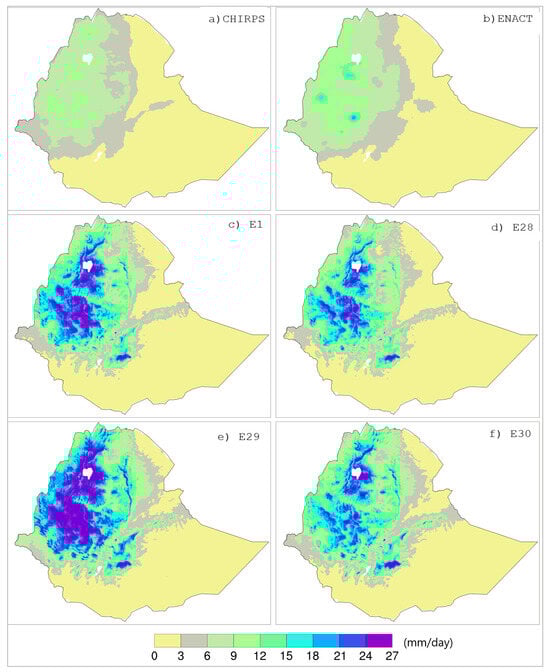 Mean JJA rainfall (mm/day): (a) CHIRPS, (b) ENACT, (c) E1 (LW/SW: RRTM/Dudhai), (d) E28 (LW/SW: RRTMG/Dudhia); (e) E29 (LW/SW: RRTMG/RRTM); and (f) E30 (LW/SW: RRTMG/RRTMG).