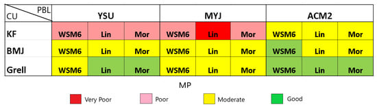 To better visualize the ranking of the scores, we subjectively defined performance categories of very good (AS < 1.0), good (1.0 < AS < 2.0), moderate (2.0 < A < 3.0), poor (3.0 < AS < 4.0), and very poor (AS > 4.0) based on the aggregate score (Figure 11). According to this classification, 22.2%, 55.6%, 18.5%, and 3.7% of experiments were assigned to the good, moderate, poor, and very poor categories, respectively. It can be seen that there is no significant difference between the MP used as their combinations with the same CU and PBL schemes fall within the same performance category (in most cases). For the CU schemes, five out of nine simulations with the Grell CU scheme produced good performance while KF performed poorly and very poorly with the YSU and MYJ PBL combinations. The KF CU performance improved to the moderate category when combined with ACM2 PBL. Among the three CU physics options, BMJ CU falls under the moderate category for all combinations except the one that used WSM6 MP and ACM2 PBL, falling under the good category. Overall, E26 (Grell CU, ACM2 PBL, and LIN MP) ranked top with an aggregated score of 1.06, followed by E27 and E25 that used the same CU and PBL but different MP schemes. Out of the top ten best performing experiments, seven used the Grell CU scheme, while the ten worst perming experiments used the KF CU scheme.