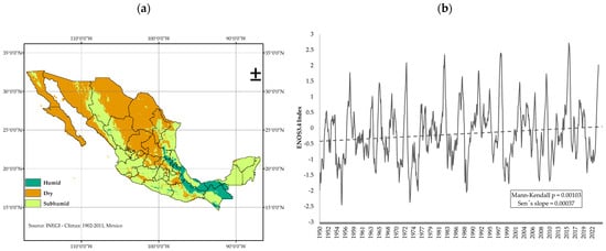 (a) Mexico’s type of humidity regime and (b) monthly historical ENSO3.4 Indices (1950–2023) and trend line (dotted line).