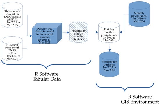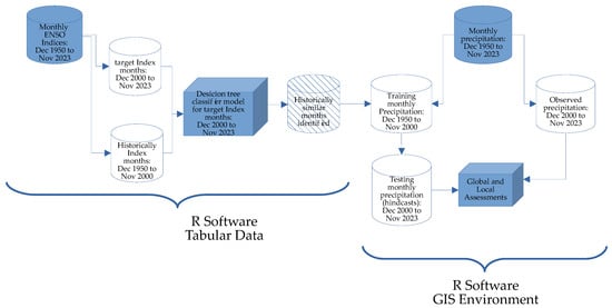 Lastly, the similar months, i.e., from the historically ENSO3.4 Index months, identified for each target ENSO3.4 Index month (TIi), were used to select rasters of precipitation training months (PTri…n) for each precipitation testing month (PTsi…n). The latter is to compute the monthly hindcasts from December 2000 to November 2023 by performing the median of the similar months identified. At this point and on, precipitation was used in a GIS−like environment (rasters) in R software (version 4.2.1) by installing raster and rgdal packages (Figure 2).