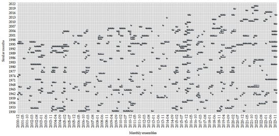 Nineteen missing hindcasts could not be computed because there were no monthly similarities. A maximum number of sixteen similar months (historical months) and a minimum of one month were identified to obtain each hindcast. It is observed that most of the similar months were in the 1960s (198) and 1990s (277) (Figure 3).