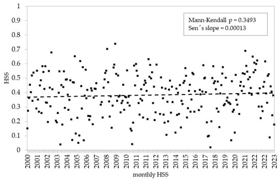 Monthly Heidke Skill Score (HSS) for December 2000–November 2023 hindcasts and trend line (dotted line).