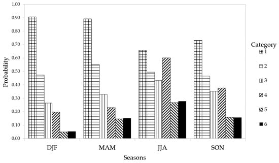 A high POD (>0.80) of the first category (1–20 mm) is observed during the winter and spring due to low precipitation observed and hindcast (dry seasons in most of the country). In summer and fall, a lower POD (>0.30) is observed for the first four classifications (1–20 mm, 21–75 mm, 76–150 mm, and 151–300 mm) because it is the period where the rainy season spans (Figure 5), and thus more classifications for the model to miss. In all seasons, higher classification performances (301–450 mm and above 450 mm) are poor because of the drawback of the model to forecast extreme events, i.e., averaging similar years removes higher values or outliers. Hence, the model tends to be climatology.