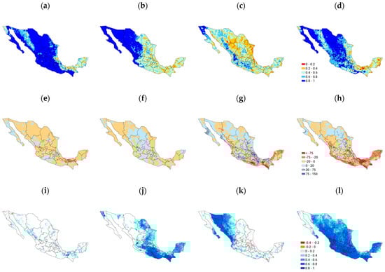 During the fall (SON), the sPC’s national average was 0.72. There are also larger areas with higher hit rates than in the summer (<0.8), especially in northern, northwest, and central Mexico. The former is because in this season, the rainy season ends in most of Mexico, i.e., easterly flows (humid) dwindle in September–October, and finally, western flows (dry) begin in November []. Lower hit rates (<0.40) are in Mexico’s far northeast, east, and southeastern. Overestimations (positive sBias) are located in most of northern Mexico since precipitation climatology is low. On the other hand, underestimations (negative sBias) are predominant in coastal southern and southeastern Mexico because of underestimations of cyclonic heavy rainfalls. The fall is the only season where significant spatial positive correlations are nearly across the country, except in northwestern Mexico (Baja California Peninsula) (Figure 6d,h,l).