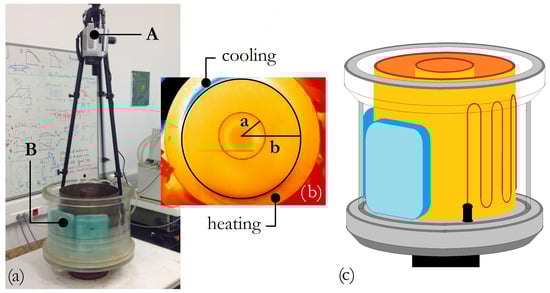 The acquired infrared images were pre-processed using VarioCAM® IRBIS® 3 thermography software (created by InfraTec GmbH in Dresden, Germany). Then, one-dimensional temperature profiles as a function of the azimuthal angle were extracted from each thermogram: one from the part that shows the “forcing temperature” at the outer sidewall just above the water surface along a circular contour of radius from the center (e.g., along the violet circle shown in Figure 3a yielding the blue curve in Panel b); and the azimuthal profile of the surface temperature field averaged over the gapwidth over the radial distances (as shown in a black curve in Figure 3b).