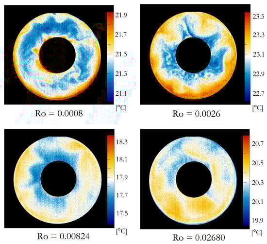 In the case of Figure 4, it is clearly visible that the surface temperature field was rather similar to those observed in the quasigeostrophic regime of the traditional configuration, showing irregular Rossby wave-like patterns []. However, this form appeared to inherit the “left-right” symmetry of the thermal boundary conditions; we note that these images were aligned such that the coldest point of the outer rim was to the top and the warmest was to the bottom. This also implies—as confirmed by our observations—that, although the pattern may change in shape over time, it does not move in the zonal direction, which is in contrast with the “eastward” propagating Rossby waves of the traditional rotating annulus setting with axially symmetric boundary conditions []. This, however, does not mean that the flow is not in quasigeostrophic balance: passive tracers tend to follow the isotherms, as will be demonstrated later in Section 3.3. In this case, the flow at the cooled side was characterized by alternating warm and cold plumes between the rim and the inner cylinder—which was warmer than the cooled side but colder than the heated sidewall.