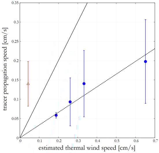 Next, the propagation of selected parts of the tracer cloud was tracked in the recorded videos using the Tracker 6.0.9 video analysis tool, and, from a linear regression of the zonal displacement time series , the slope of the fitted lines was taken as the estimate of the average zonal speed . As different parts of the initial cloud propagated at different rates, this procedure yielded a range of values, whose averages are given as the data points of Figure 7 as a function of the theoretical prediction with Equation (1), which is based on the measured zonal temperature contrast . The length of the error bars corresponded to the maximum difference between the observed drift rates in each given run.