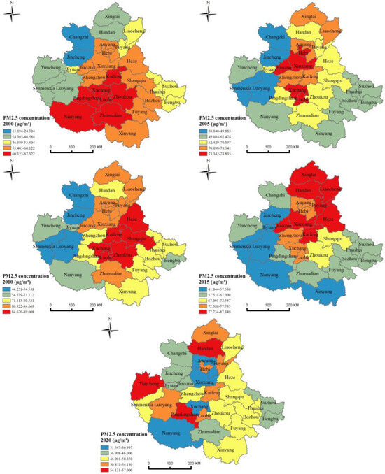 In this study, the average annual PM2.5 concentration data (μg/m3) of 30 cities in the Central Plains urban agglomeration from 2000 to 2020 are summarized according to the Monthly Report of National Urban Air Quality released annually by the China Environmental Monitoring Station. The spatial visualization analysis was carried out by ArcGIS 10.8 software, and the natural breakpoint method was used to divide 30 cities into five categories according to the pollution degree (Figure 2).