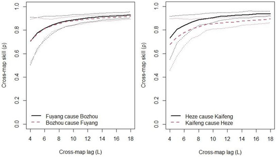 In CCM, the significance of convergence is to verify the causal effect of the dependent variable on the outcome variable. By observing the convergence of the predictive power, we can effectively infer a causal relationship between two variables and ensure that the relationship is stable and credible. It is necessary to observe whether the predictive power of the cross mapping converges to a certain peak when identifying the causal relationship between the variables using the CCM method. When the cross-map lag L reaches its maximum value, the cross-map skill ρ can measure the intensity of air pollution interaction between city A and city B. Due to the space limitation, the two groups of cities with the largest CCM coefficients are selected in this thesis as representatives, and the results are shown in Figure 3. The CCM correlation coefficients of air pollution between Fuyang and Bozhou are at a high level, and the CCM curves converged to a higher level with the expansion of the prediction intervals, which indicates a close interaction of air pollution between them. The CCM curves between Heze and Kaifeng are also at a high level, but there is a gap between the two CCM curves, indicating that the changes in air pollution in Heze are more predictive of the level of air pollution changes in Kaifeng.