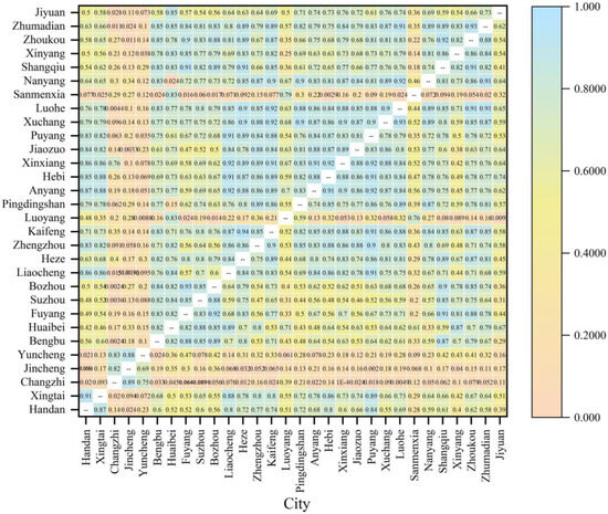 This paper constructs a 30 × 30 matrix for SNA, based on the interaction coefficients’ size and significance regarding air pollution among 30 cities. The maximum possible number of spatial interactions among 30 cities is 870 (30 × 29), while the total number of tested significant causality is 527 (Figure 5). The overall network density of the air pollution correlation network among 18 cities is 0.606 (527/870) and indicates that air pollution among 30 cities shows significant network relationships during the sample study period. The air pollution linkages among cities account for 61 per cent of the total linkages, and the spatial interactions are not only limited to the neighboring cities, but also show a multi-threaded, multi-city, and cross-region network distribution within the urban agglomerations. The correlation coefficient of the air pollution network among cities is 1, indicating a strong interconnected relationship among all cities. The Central Plains Urban Agglomeration exhibits an air pollution network efficiency of 0.345, suggesting that over 65% of the connections are redundant. Additionally, a superposition phenomenon is observed in the correlation of air pollution between various cities within the agglomeration, indicating a strong network stability. A network hierarchy of 0.186 reveals a lack of clear hierarchy among cities, indicating that the status and role of each city are similar. This underscores the need for collaborative efforts from all cities to effectively manage air pollution in the urban agglomeration.