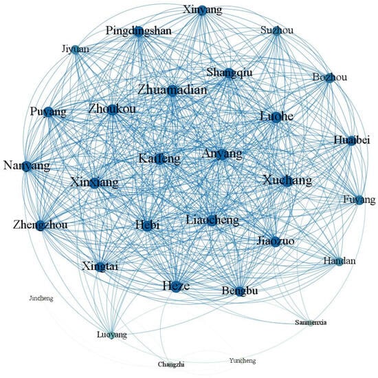 The mean betweenness centrality of 11.267 highlights that certain cities act as key connectors within the network, managing the linkage relationships. Specifically, five cities exceed the average betweenness centrality, serving as essential “bridges” and “intermediaries.” On the other hand, peripheral cities in the Central Plains Urban Agglomeration display lower betweenness centrality, indicating a reduced influence on the network.