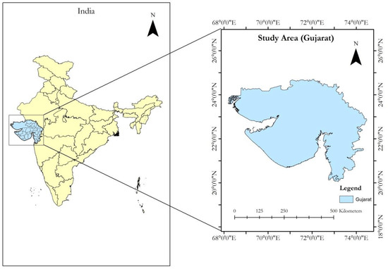 Gujarat is the fifth largest state in India in area and is located along the western coast, extending between latitude 20°06′ to 24°42′ N and longitude 68°10′ to 74°28′ E. The mean elevation of Gujarat is 137 m asl. The climate of Gujarat [27] is usually characterized by a subtropical steppe climate, according to the Köppen classification, with an average BSh (hot, semi-arid) and local BWh (hot, arid deserts) and BSh/Aw (Aw is tropical climate, see the Tables in Section 3. The mean daily temperature across the year is 29.55 °C. Gujarat receives a yearly mean of 589 mm of precipitation (rain), with 61 rainy days (16.66% of the whole year), which means that the days are usually sunny, and the sky is clear during the night. This allows dew to condense. However, the mean annual rainfall over Gujarat varies widely, from 300 mm in the western part of Kutch to 2100 mm in the southern part of Valsad and the Dangs (towards Mumbai) districts. The monsoon season extends from mid-June to September when the rain happens.