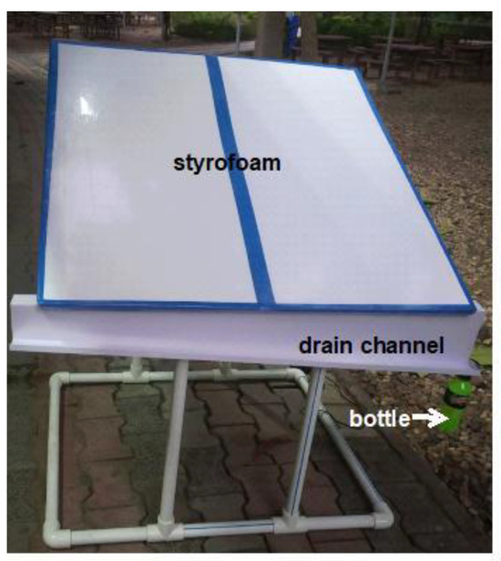 The dew condenser is, thus, composed of three different parts. First, the surface area of the condensing panel is 1 m2. It is inclined at a 30° angle from horizontal at 1.05 m from the ground. The justification for this value is as follows. First, this height has to be above the roughness length where the wind speed becomes zero (typically here 0.1 m). Second, the condenser has to be above the influence of water vapor coming from the ground, called “distillation” [36]), with a length also on the order of 0.1 m. The studies [37,38] show that an angle near 30° is the optimal inclination, as this minimizes the heat-exchange effect caused by wind, while not reducing much radiative cooling and allowing water to be efficiently recovered by gravity. The panel includes the following parts: a condenser sheet, styrofoam, and a cardboard sheet. The condenser sheet is the most important part of the entire dew collector unit. Dew condenses based on the radiative cooling property of the condenser, and water drops slide down due to its wetting properties. Two different materials were used based on their availability on the market. One is a transparent polyethylene sheet, and the other is UV-stabilized black low-density polyethylene foil. Both were kept at DA-IICT ground to check their yield. The black foil has higher radiative cooling and, hence, a somewhat higher dew yield compared to the transparent polyethylene sheet, due mainly to its higher emissivity of ~0.98 [39] versus ~0.87 [7]. The emissivity difference matters only during the early times of condensation, when the surface is mostly dry. Later, surfaces are wet and exhibit the same emissivity close to that of water (0.98) [29].