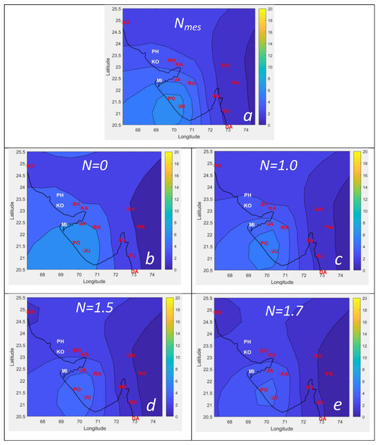 The mean dew volume ratio for the period 2005–2013, ϵ(N) = experiences the following results: = 1.40 ± 0.19; = 0.99 ± 0.18; = 0.83 ± 0.18; = 0.76 ± 0.17. The best comparison is obtained for N = 1.0, as seen in the maps of Figure 3. It leads to the conclusion that, in the period 2005–2013, the kriged map with N = 1 well corresponds to the map calculated with Nmeas. In the following calculations for the period of 2014, we will use a mean value of N = 1 whenever this parameter is missing.