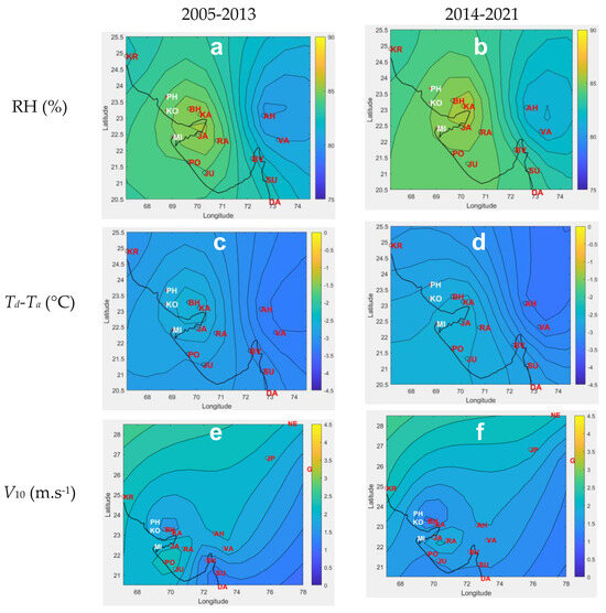 Kriged map (zoomed on the Gujarat area) during dew condensation for (a,b): RH (%) values; (c,d): Td − Ta (°C); (e,f): V (ms−1). For 2005–2013 N = Nmeas (a,c,e); for 2014–2021: N = 1 imposed (b,d,f). Black circles: Meteorological airport stations for kriging; Panandhro (PH), Kothara (KO), and Mithapur (MI) are sites where dew yields are measured (see text). The other letters refer to the stations (see Table 1 and Table 2).