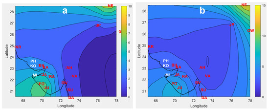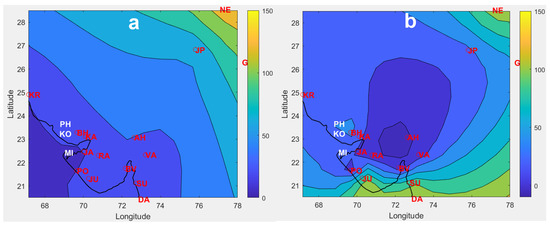 Kriged map for yearly dew yields (mm). (a) 2005−2013 with Nmeas; (b) 2005−2021 with N = 1 for missing data. Red circles and letters: meteorological airport stations for kriging; white letters: dew measurement sites, Panandhro (PH), Kothara (KO), and Mithapur (MI).