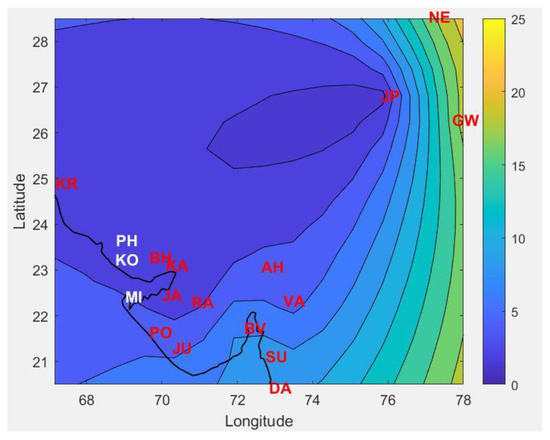 The increase in dew volumes is, nevertheless, heterogeneous when looking at Figure 6. With the exception of the city of Jaipur, where the increase is limited to about 2 mm, the areas of New Delhi and Gwalior show a stronger increase in dew yields (more than 15 mm over the period). These regions are already showing high dew yields; see Figure 5, which will then be reinforced. In the southern part of the region, coastal sites, such as Daman, Surat and Bhavnagar, exhibit yield increases of 5–8 mm over the period. The least advantaged micro-region remains the west coast and the northern part of Gujarat state (from Panandhro to Rajkot), where the increase is limited to a few mm. These regions, however, exhibit the largest yields in the area (see Figure 5). The main changes are, thus, observed on the axis SSW to NE, where only a weak increase is found for the Gujarat regions, such as near Porbandar and Junagadh, and a neat increase in the NE of the domain, near New Delhi.