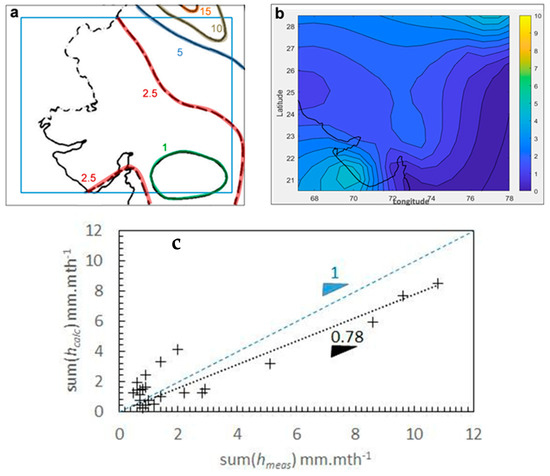 Four stations in [17] also appear in our database, namely, New Delhi, Surat, Vadodara (Baroda), and Rajkot. For the years 1969 and 1970, the dew deposition (mm) averaged at these sites was measured between October and March. Figure 7c compares the mean measured monthly dew yields (mm) versus the mean estimated monthly dew yield obtained in our study between 2005 and 2013. Even though the periods are different, modeled and measured data are in reasonable agreement, as shown by the ratio of time-summed values (integral) sum(hcalc)/sum(hmeas) = 0.78 (R2 = 0.79).