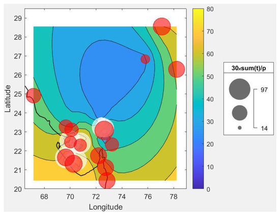 Here, Card represents the number of elements for the given condition. The projected semi-variograms are fitted by a spherical model already proposed for rainfall spatial estimation [45,46,47,48,49]. When the coordinates of the ground-measured stations (e.g., Kothara or Panandhro) do not correspond exactly to a kriging point, we have considered the nearest grid point to determine the estimated values.