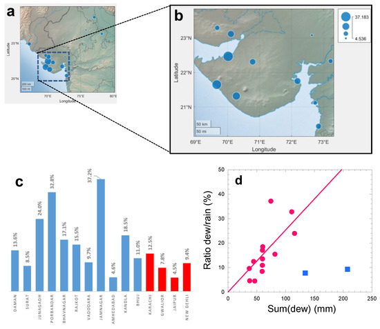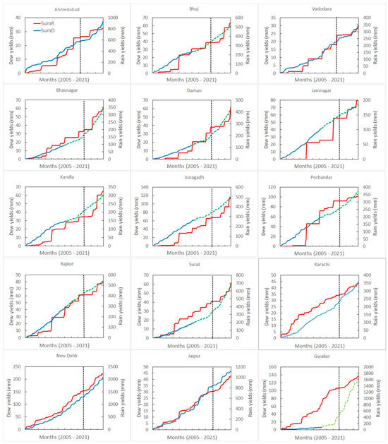 Dew yields were computed from Equations (1)–(4) with time period ∆t = 0.5, 1, 3 h, depending upon the sites. The wind directions are computed from the sectors (N, NNE, NE, E, ESE, SE, S, etc.) by using a standard law of proportionality, which is 0° for north and 180° for south. Cloud cover in oktas was computed from the observation of sky cover using the correspondence from the National Weather Service glossary [35]: CLR (clear): N = 0; FEW (few): N = 1; SCT (scattered): N = 3; BKN (broken): N = 5; OVC (overcast): N = 8. The rainfall data, available on a daily time step, are extracted from the National Data Centre, Pune, for 11 cities, including the stations in Gujarat that are reported in Table 1, whose meteorological data are also used for the stations noted in Table 1. For Karachi, New Delhi, Jaipur, and Gwalior, rainfall data (2005–2021) are extracted from the ERA5/ECMWF model [34] using the historical land monthly averaged database from 1950 to the present (see Table 2). The study period is from 2005 to 2021.