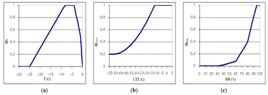 All previous works estimating in-flight icing potential used membership functions, producing interest maps showing the potential icing formation’s dependence on different meteorological parameters, such as temperature (MT), relative humidity (MRH), cloud top temperature (MCTT), accumulative precipitation rate (MP), vertical velocity (Mvv) and cloud liquid water content (MCLWC), that are mainly based on cloud physics principles, forecasting, research and PIREP observations (e.g., [8,12,13]). Here, the membership functions applied are shown in Figure 1. The membership functions for MT, MRH, MCTT, 3-h MP and Mvv were adopted from [12], while the membership of cloud liquid water content (MCLWC) by Belo-Pereira [13] was used instead of the Supercooled Liquid Water Content of [12], as it was not available in the COSMO model output. Additionally, it has been suggested that the use of CLWC in the icing forecast may reduce the false rates as supercooled cloud water is generally underestimated by the NWP models [8,13].
