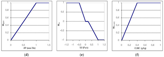The membership functions for (a) temperature; (b) cloud top temperature; (c) relative humidity; (d) 3haccumulative precipitation; (e) vertical velocity and (f) cloud liquid water content. Membership functions from (a–e) were adopted from [12], while membership function (f) was adopted from [13].