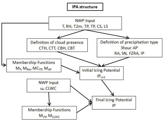The Icing Potential Algorithm (IPA) developed for the present work to estimate the in-flight icing is based on the Forecast Icing Potential (FIP) algorithm developed at the National Center for Atmospheric Research (NCAR) [8,12]. In particular, the IPA calculates the capacity of the atmosphere to develop icing at a given flight level in favorable meteorological conditions. It uses the structure of the FIP algorithm, whichinvolves several key components and steps, and a fussy logic method to handle the inherent uncertainties and complexities in predicting in-flight icing conditions, as initially proposed by [4]. This method enables the definition of the FIP in different possible icing conditions, starting from the estimation of the formation of clouds and type of precipitation occurrence for various mixed meteorological situations and scenarios.