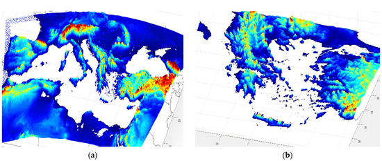 For the current study, the model was implemented with two one-way nested domains, COSMO-GR1, the convective-scale-resolving version with a horizontal resolution of 0.01° (approximately 1 km), initialized from COSMO-GR4 with a resolution of 0.04° (approximately 4 km) with parameterized convection. The coarse domain covered the broader Mediterranean region, while the inner domain encompassed the greater geographical area of Greece. In terms of the vertical axis, 80 vertical levels were utilized, extending up to 30 hPa, covering most of the atmosphere, with increased resolution near the boundary layer, starting from a few meters above the surface (20.0 m) using a terrain-following approach [22]. The ECMWF IFS operational analyses served as the initial and lateral boundary conditions for the coarse domain. For the present case study application, the model was initialized at 12:00 UTC on 11 March 2019 and run for a 48 h forecast period. Model output was available at hourly intervals. The integration areas of the models are shown in Figure 3.