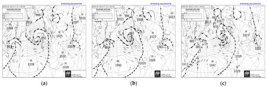 UKMO analysis charts: (a) 12 March 2019 12UTC; (b) 12 March 2019 18UTC; and (c) 13 March 2019 00UTC (from https://www1.wetter3.de/archiv_ukmet_dt.html, accessed on 30 September 2022).