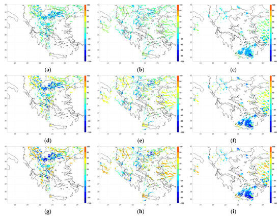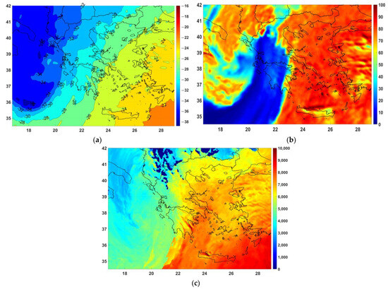 In addition, the IPA estimated the height of the base (Figure 8) as well as the height of the top of the clouds (single or multiple) as well as their corresponding temperatures (Figure 9). The clouds over the area of Greece seemed to expand from less than 5000 ft, in certain areas where the cold front was expected to be present, up to 40,000 ft, indicating deep convectivity in those regions, if single clouds are present, with their temperature ranging from positive values or close to 0 °C to −30 °C to −40 °C. Specifically, the cloud base temperature exhibited positive values mainly at the location of the warm section between the cold and the warm fronts, as shown in Figure 9. The cloud top temperature was generally negative, apart from the areas where the height of the cloud top was small and the clouds forecasted extended to less than 10,000 ft (Figure 8). The expected type of the clouds is discussed in the following sections.