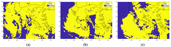 Cloud mask field estimated by the IPA: (a) 12 March 2019 12UTC; (b) 12 March 2019 18UTC; and (c) 13 March 2019 00UTC.