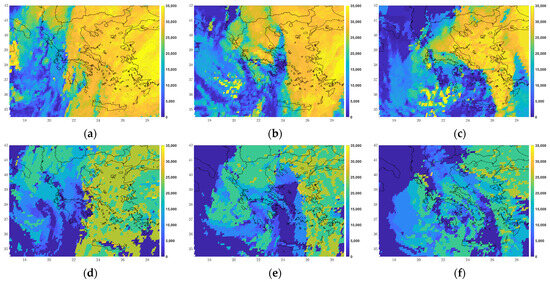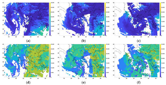 Figure 13 illustrates (at the top) maps of the cloud top height, as observed by the satellite, and (at the bottom) the corresponding height resulting from the IPA on 12 March 2019 at 12UTC and 18UTC and on 13 March 2019 at 00UTC. At first glance, it was shown that the height of the cloud tops was generally underestimated by the algorithm (by at least 5000 ft) at most of the locations, although there was a similarity in the presence of the clouds and the general cloud mask, indicating the accordance with the low-pressure system and the associated fronts captured by the IPA, as already discussed. In general, the difference between satellite and the IPA CTH may lay in the fact that these two datasets are not numerically equivalent, having different horizontal resolutions. They were forced to be fitted in the same grid with interpolation and they both include possible errors in calculating CTH; the satellite CTH involves calculations through the temperature values estimated by the measured radiance and IPA values involve possible errors in the NWP temperature and relative humidity forecasts. Despite those differences, from the icing perspective, it was found that at heights generally greater than 30,000 ft, icing formation is not significant due to the reduced presence of SWDs, hence the underestimation of the height by the IPA compared to the satellite CTH was not as important as identifying the location of the clouds.