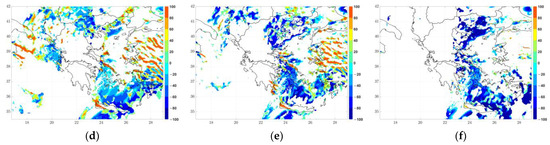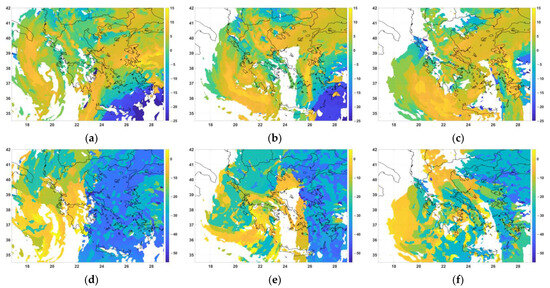 Cloud base temperature: (a) 12 March 201912UTC; (b) 12 March 2019 18UTC; and (c) 13 March 2019 00UTC. Cloud top temperature: (d) 12 March 2019 12UTC; (e) 12 March 2019 18UTC; and (f) 13 March 2019 00UTC, as estimated by the IPA.
