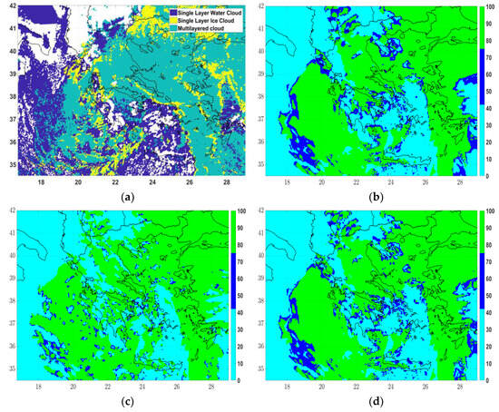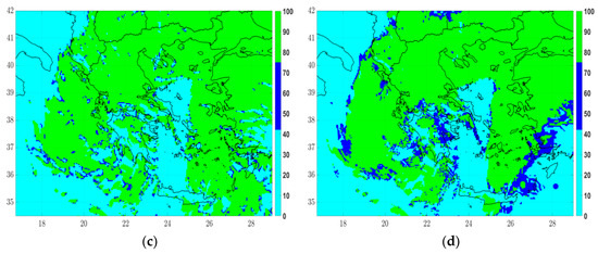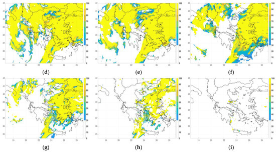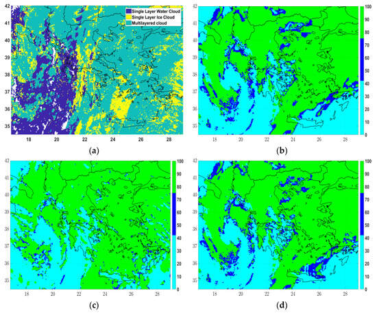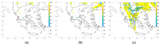 The optimal cloud analysis product for cloud phase was retrieved at 12UTC and 18UTC on 12 March 2019 and at 00UTC on 13 March 2019 and compared with the corresponding fields of IPS0, IPS2 and IPS3 (Figure 14, Figure 15 and Figure 16, respectively) over Greece. The satellite CP fields indicated single-layer water clouds (code 111-dark blue color), single-layer ice clouds (code 112-yellow) and multi-layer clouds (code 113-light blue). At the same time, the maximum IP fields were illustrated using threshold values similar to those generally used for identifying the severity of icing, namely for IP < 42.5% corresponding to “none-light icing”, 42.5% < IP < 75% corresponding to “moderate icing” and IP > 75% associated with “severe icing” [30].