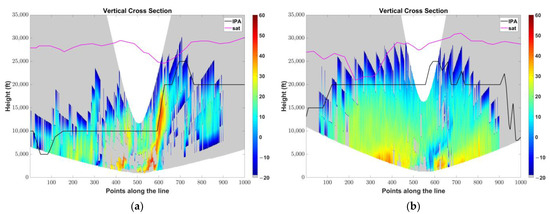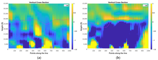 As the results of the IPA are based on the COSMO-GR NWPs, it is worth exploring the behavior of vertical velocity at the selected cross sections. Figure 21 illustrates the vertical velocity in the form of omega (ω), as was implemented by the membership function, at cross sections 1 and 2 on 12 March 2019 at 12UTC and 18UTC, respectively, together with the corresponding satellite cloud top height. It is reminded that negative ω corresponds to upward air motion, thus at 12 UTC (Figure 21a) COSMO-GR predicted upward and downward air motion alongside to each other (mainly from point 250 to 550) at cross section 1 within the first 10,000 ft from the surface and the values of ωexceeded −1.5 Pa s−1 or +1 Pas−1. This pattern is indicative of local convective cells within these areas. On the other hand, at 18 UTC (Figure 21b) ω exhibited higher negative values exceeding −1.5 Pa s−1 that expanded over the largest part of cross section 2 (from point 200 to point 850), suggesting more intense convectivity over the region. This is in accordance with the radar reflectivity observed showing the phenomenon expanded and was more active over that part of central Greece (Figure 17b), suggesting vertically developed clouds (up to approximately 25,000 ft) associated with icing formation, as already discussed. Hence, since vertical velocity seems to be a key parameter in the simulations of the particular synoptic situation, its effect on in-flight icing and its relationship with various cloud types and convectivity needs further investigation and is one of the future plans of our research.