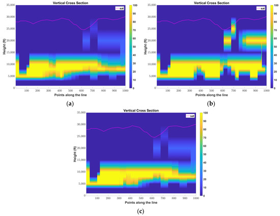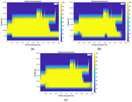 COSMO-GR predictions of (a) temperature and (b) relative humidity at 20,000 ft and (c) the 0 °C isotherm height on 12 March 2019 12UTC.
