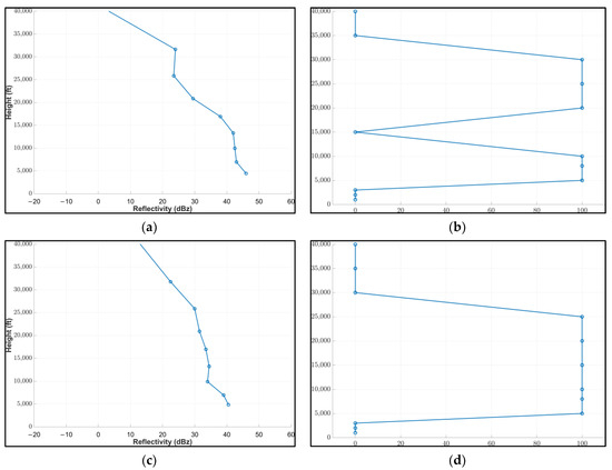 Vertical profiles at Nea Aghialos location (LGBL) of (a) Larissa radar data and (b) IPS2 on 12 March 2019 at 12UTC and (c) radar data and (d) IPS2on 12 March 2019 at 18UTC within a radius of 25 km. The horizontal axis of the radar data is in dBz and of the IP in percentage, while the vertical axes are in feet.